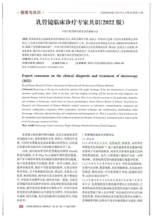 首都医科大学附属北京中医医院乳腺科作为中国中医药研究促进会乳腺病分会主任委员单位,为普及乳管镜在临床实践中的应用,优化和标准化其技术操作规范,提升我国乳管镜诊疗整体水平,基于现有实践经验和国内外相关临床研究成果,与本领域专家共同书写并发表了国内首版乳管镜专家共识《乳管镜临床诊疗专家共识(2022版)》。