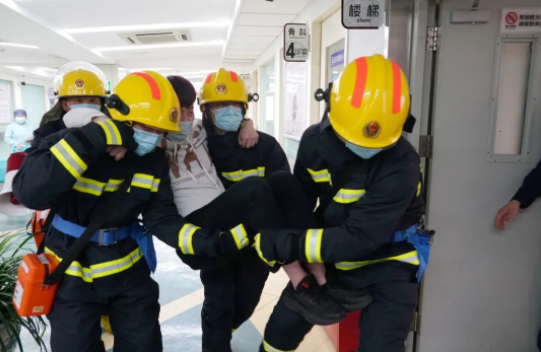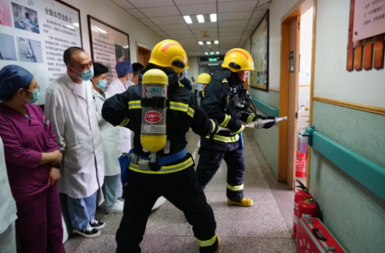 中控室接警后,立即启动应急预案,迅速通知应急队前往救援,并开启应急广播,引导疏散患者。医院微型消防站迅速启动,正在巡逻的队员形成第一力量,携带灭火器55秒赶到现场支援,其他队员穿戴防火服、空气呼吸器3分钟内赶到了现场,处置组打开消火栓,取枪头,展水带,开阀门,完成喷水准备;警戒组拉起警戒线,阻止无关人员进入;疏散组打开扩音器,疏散正在候诊的患者;救援组协助搬离行动不便的病人。