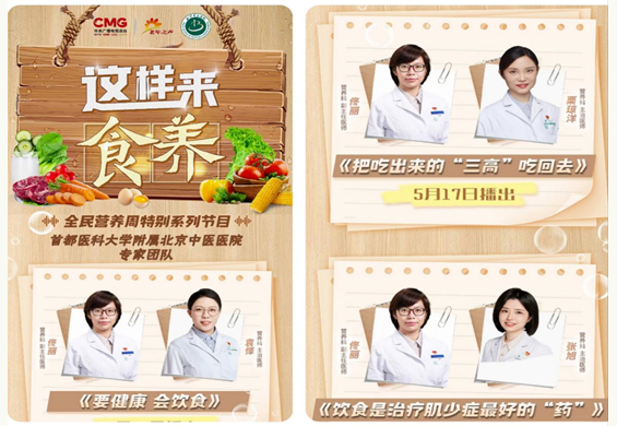 在与中央广播电视总台老年之声栏目合作录制的全民营养周系列特别节目中,营养科青年医师齐上阵,分别录制了《要健康 会饮食》、《把吃出来的“三高”吃回去》、《饮食是治疗肌少症最好的“药”》。该广播节目在云听、学习强国客户端网络平台可收听,收获听众好评。
