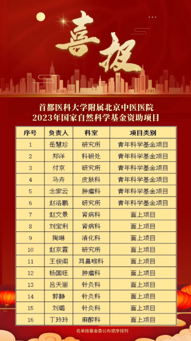 8月24日,国家自然科学基金委员会公布了2023年度国家自然科学基金项目评审结果。首都医科大学附属北京中医医院获资助项目16项,其中面上项目10项,青年项目6项。