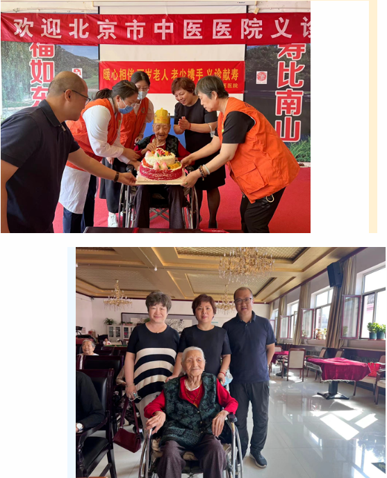 9月13日,北京中医医院党委专职副书记温淑兰携离退办、团委、妇科、干保科、营养科一行10人前往昌平区崔村香堂敬老院,为医院百岁老职工邹若蘋庆祝104岁寿辰,大家带着真诚祝福和深切关爱,为老寿星送上生日蛋糕和鲜花,共祝邹老健康长寿。