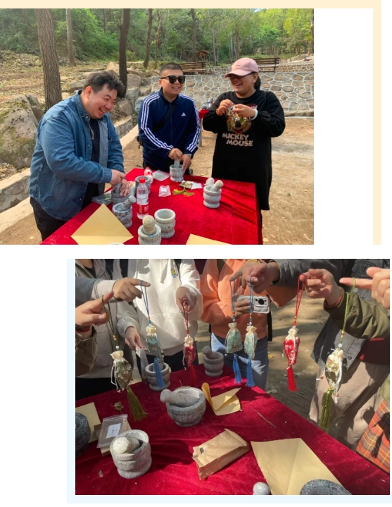 除了识药辨药,职工们化理论为实践,亲自动手研制起药丸。在药王谷四气广场,香囊制作体验区,职工们通过选料、研末、包装等环节,齐心协力,分工合作,最后佩戴自己制作的香囊,“一嗅解忧愁”。