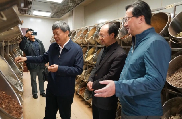 调研组一行走访明医馆,了解医院名老中医药专家传承谱系及中医诊疗特色。在门诊智能化代煎药房,刘清泉向调研组介绍了医院智能化、现代化煎药室饮片调剂、中药煎煮以及发药的全流程。徐春军陪同参观。