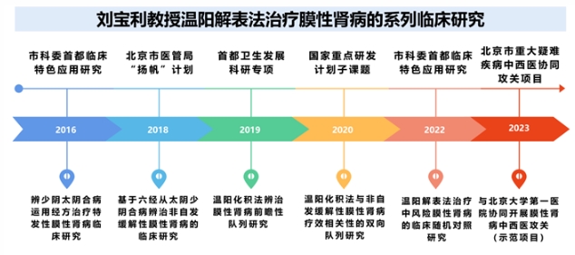 刘宝利教授团队通过专病门诊,应用单纯中药辨治膜性肾病,不使用免疫抑制剂,以温阳解表法为主要治法,选用经方麻黄附子汤合肾着汤为主方,接诊了来自全国各地的1000余例患者,已形成国内膜性肾病中医治疗的较大队列。其中超过1/3的患者既往经过了激素、免疫抑制剂等治疗,然而未能达到缓解,或频繁复发,最终选择了中医药治疗方案。为解决目前的临床困境,获得循证医学证据,刘宝利教授团队主持了多项省部级以上膜性肾病临床课题,包括科技部重点研发计划子课题1项、首都特色临床研究2项、首都卫生发展专项及“扬帆”计划各1项等。
