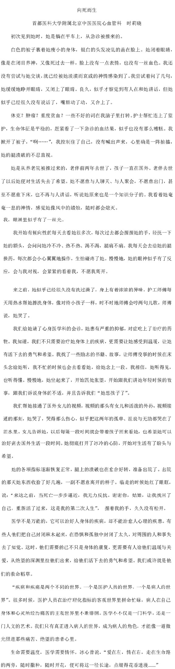 近日,北京市医管中心组织协调协同内外叙事医学相关专家,对平行病历进行评审,北京中医医院选送的1篇平行病历《向死而生》获评三等奖。