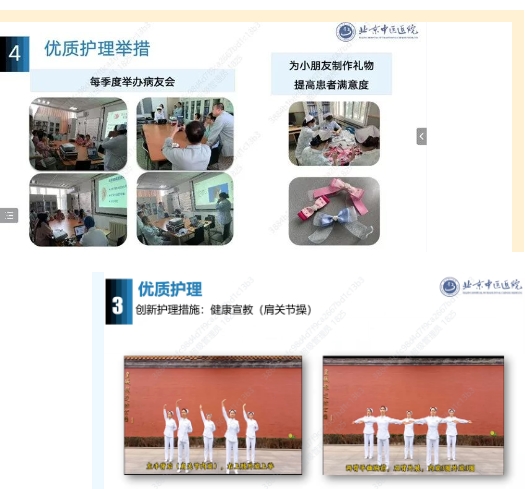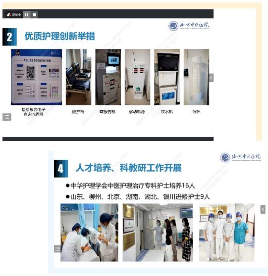 2023年,北京中医医院优质护理服务覆盖率达到100%,不良事件上报率与整改率达到100%,护理门诊工作量较2022年同期上涨46.1%;培养中西医结合专科护士、中医护理治疗专科护士、透析专科护士等14名,重症救治护理骨干4名;接收北京卫生职业学院、北京城市学院等护理实习生51名,接收来自云南、宁夏、内蒙、广西等13个省市24家医疗机构的86名进修人员;发表中、英文期刊论文42篇,授权实用新型专利7项,获批院级课题2项、局级课题1项、北京市教育科学规划课题1项;举办东城区级继续医学教育项目53项,北京市级继教项目2项,国家级继教项目1项,采取有力措施促进我院护理专科高质量发展,为患者提供精准专业护理服务、提高护理人员工作积极性和满意度。