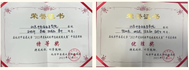 近期,北京中医医院教师在北京市和北京中医药大学组织开展的教学比赛中取得良好成绩。肿瘤科程培育参加北京高校第十三届青年教师教学基本功比赛获得三等奖;由ICU王旭升、综合科李璐、针灸科李斗和心血管科张振民组成的队伍在北京中医药大学急救技能大赛中荣获特等奖,由急诊科徐向东、曲志成、徐光勋和杨宇飞组成的队伍在北京中医药大学急救技能大赛中取得优胜奖;针灸科侯学思参加北京中医药大学教学查房比赛获得中初级组三等奖。