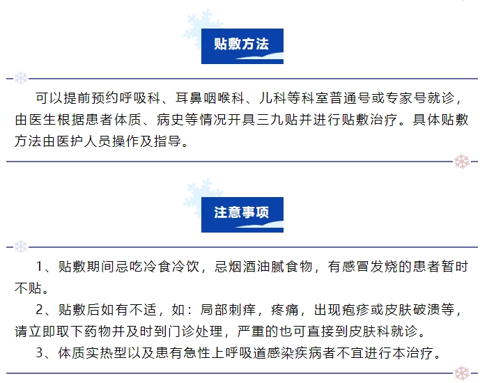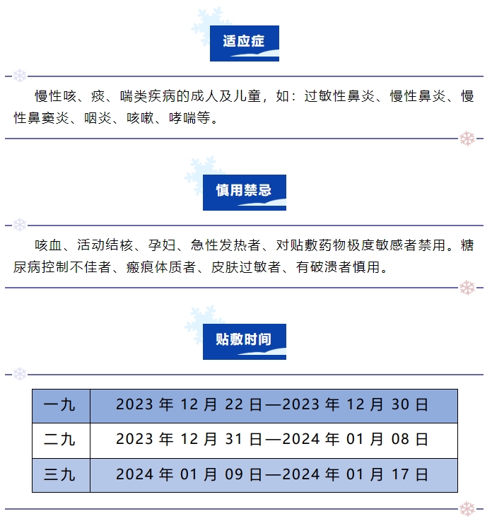 冬季是感冒、支气管炎、肺炎、哮喘、过敏性鼻炎、咽炎等各类呼吸系统疾病的高发季节。此时天气寒冷,阳气敛藏,气血不畅,皮肤干燥,毛孔闭塞。中医传统理论认为,如此时进行贴敷穴位,能够起到温阳益气,化痰通络,止咳平喘的作用,而且也会对夏天三伏贴的疗效起到加强和巩固的作用。