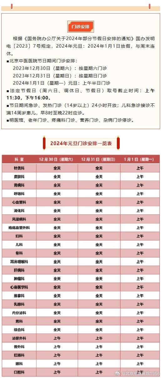 宽街·便民 | 北京中医医院2024年元旦门诊工作安排