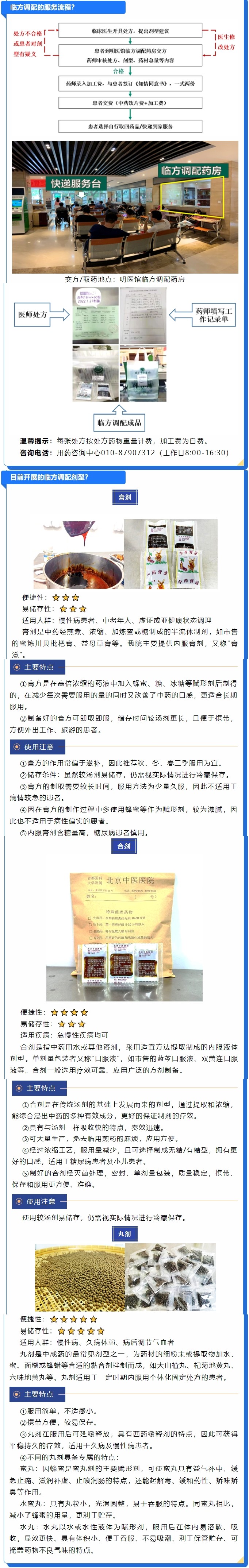为充分发挥中药的疗效,满足各种传染病、急性病、慢病的治疗特点,北京中医医院药学部开展中医药临方调配特色服务,开展“一人一方”,个体化临方加工,使传统的中药剂型更加贴近患者“三效”、“三小”、“五方便”的临床需要。