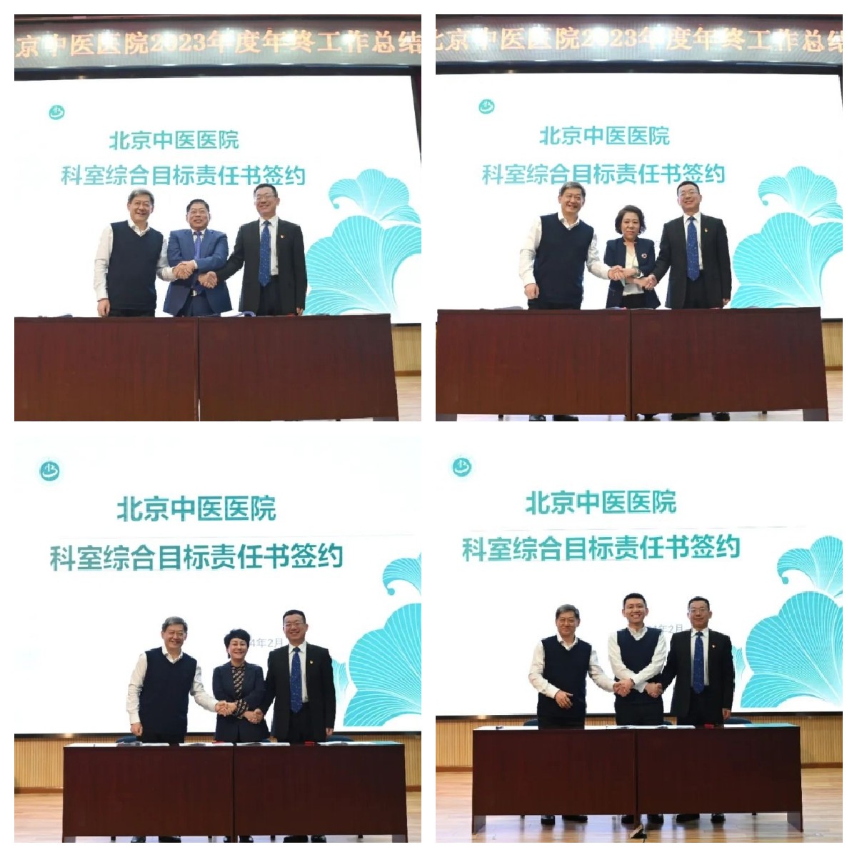 会议期间,刘中勋、刘清泉与代表医院科处室的耳鼻咽喉科、肾病科、超声诊断科、教育处四位负责人签署了科室综合目标管理责任书。