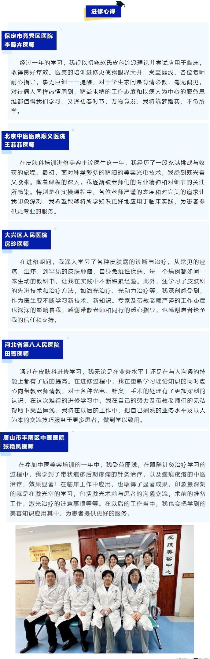为保证中医医疗美容安全,促进中医医疗美容高质量发展,积极响应国家《“十四五”中医药发展规划》和《关于加快中医药特色发展的若干政策措施》,充分落实《关于进一步加强医疗美容行业监管工作的指导意见》,首都医科大学附属北京中医医院皮肤科皮肤美容中心作为北京市美容中医技术指导与培训中心,截止目前已培养30余名美容中医医师。通过中医美容的基础理论与实操规范化培训,为美容中医主诊医师资格申请备案提供依据。