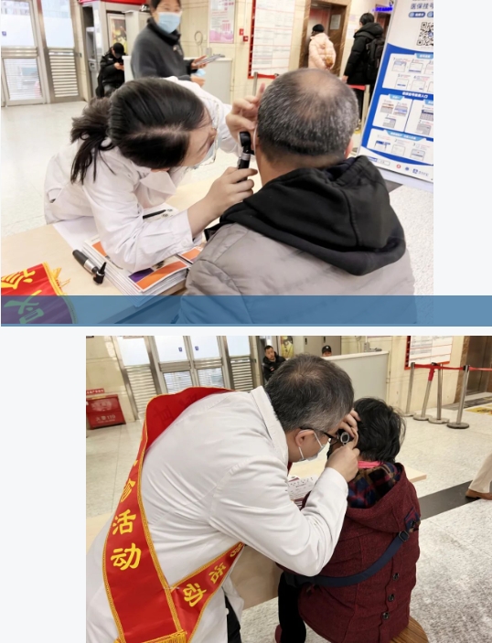 义诊活动中,医师为现场前来咨询的患者进行外耳道镜检,并免费发放测听卡,为疾病早期检测提供便利。
