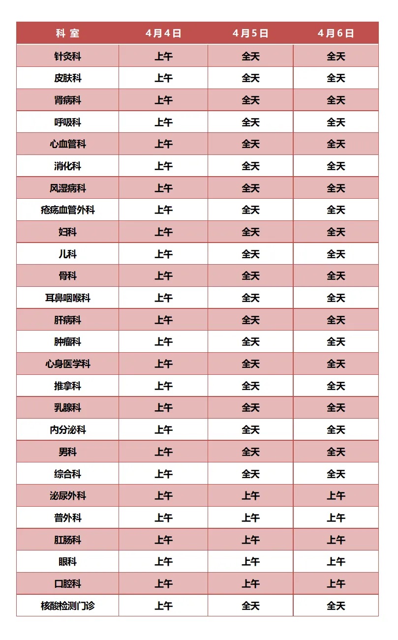 4月5日(星期五):按星期日出诊,全天门诊。(取号截止时间为上午11:30,下午16:00)