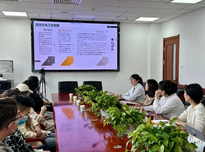 医务社工部一线社工余嘉懿向学生们详细介绍了医务社会工作的具体内容和日常工作流程。医务社会工作通过关怀患者、促进医患沟通、疏导心理情绪、组织医疗救助、改善家庭社会功能等方面工作,为患者提供全面、细致、人性化的医疗服务。通过一线社工分享工作经验和案例,学生们对医务社会工作有了更直观的感受。