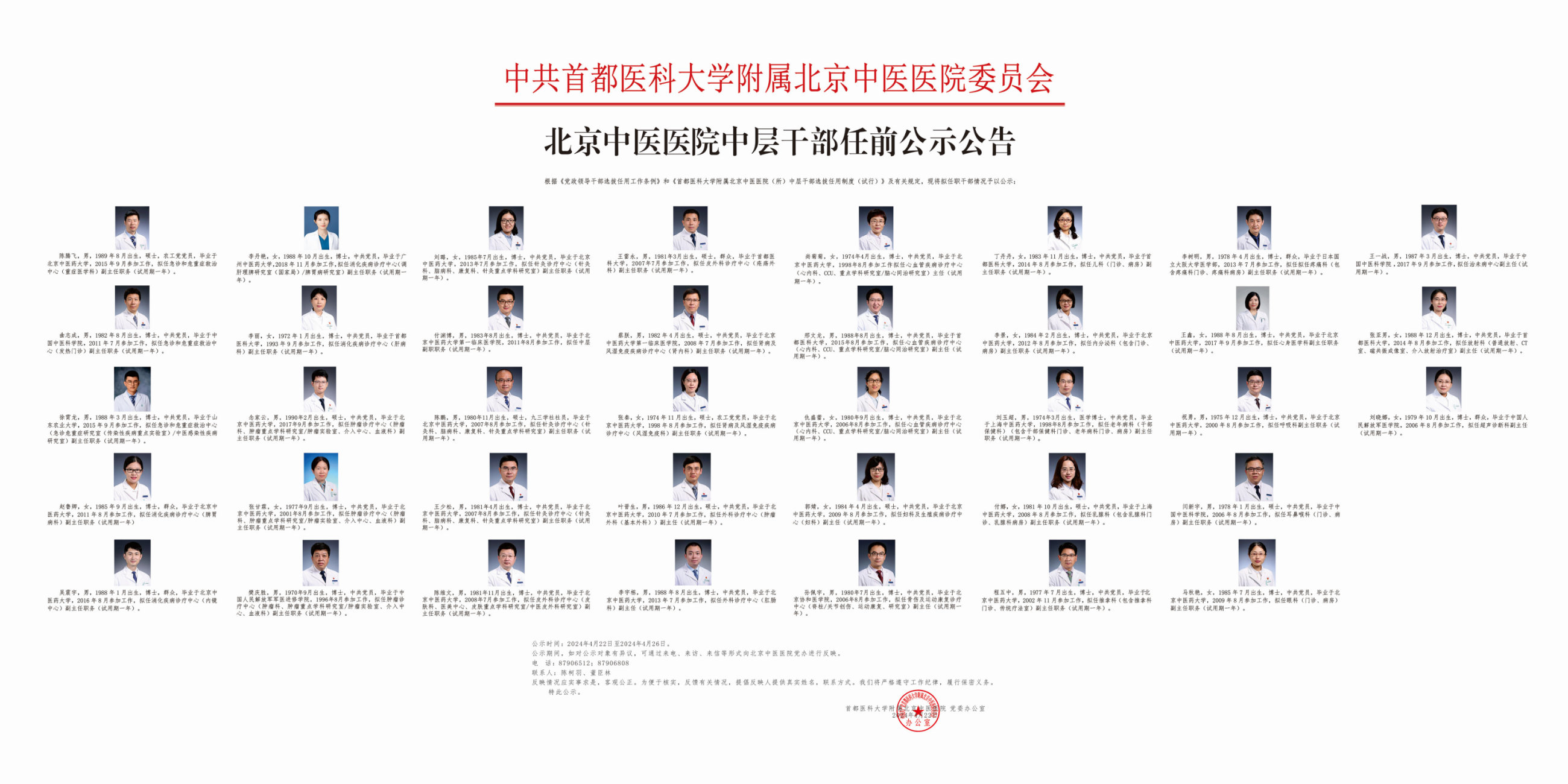 本轮竞聘组织严密,竞聘每个阶段性环节和流程都面向全院公开,通过张贴、发放竞聘公告、竞聘流程公告、考察预告、任免公示公告等公告的方式,力争做到全公开,稳推进。在考察环节,医院党委精心组建6个考察组,各考察组深入到竞聘者所在科室、党支部及身边同事,听取民意,了解实情;对于跨学科竞聘者,考察组同时去到其原生科室及竞聘科室了解情况、民主测评。对于考察结果,班子成员充分沟通,医院党委发扬民主集中制,按照集体领导、民主集中、个别酝酿、会议决定的原则,最终拟任38位干部。