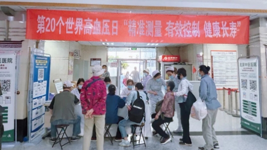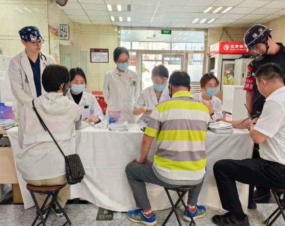 北京中医医院心血管科团队在高血压日当天进行义诊咨询,发放健康宣传手册,为群众提供免费的血压测量、健康咨询等服务。