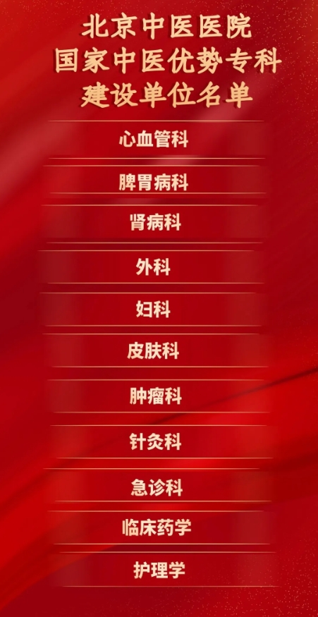 国家中医药管理局日前印发《关于公布国家中医优势专科建设单位和培育单位名单的通知》,遴选确定了1073个国家中医优势专科建设单位和85个国家中医优势专科培育单位,北京中医医院心血管科、脾胃病科、肾病科、外科、妇科、皮肤科、肿瘤科、针灸科、急诊科、临床药学、护理学共11个专科入选建设名单。