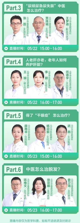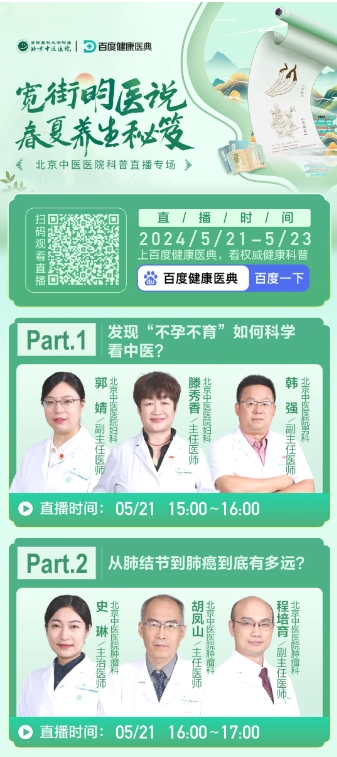 北京中医医院联合百度健康医典开展宽街明医说·春夏养生秘笈系列直播活动。自5月21日起,北京中医医院9个诊疗中心18位临床专家,在6场直播中与您共话健康。北京中医医院微信视频号、抖音、快手、微博、头条号等官方平台同步直播,快点预约,来与专家互动吧。