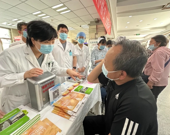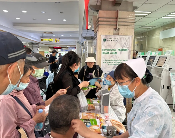 5月27日,北京中医医院皮肤科在门诊大厅举办“第十八届525全国护肤日”义诊咨询活动。皮肤科主任医师周冬梅,张苍、杨岚、陈维文、周涛,副主任医师朱慧婷,主治医师蔡一歌,护士长龚永红参与义诊咨询,副主任护师胡薇和北京中医药大学护理学院跟师见习生为患者提供因人制宜的耳穴压丸体验服务。
