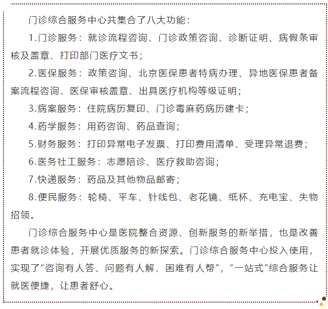 编写就医“速通攻略”,因地制宜,打造“宽街”特色门诊服务。让患者“少跑路、少敲门、少排队”是门诊综合服务中心建设的初衷。为此,医患关系协调办公室作为牵头科室,在大量调研及实地参访的基础上,结合医院实际情况,编写宽街就医“速通攻略”,预测患者就诊过程中可能遇到的问题及需求,确定综合服务中心的功能。调查中发现,患者复印及借阅住院病历的需求较大且咨询问题多,而医院病案室位于门诊楼四层,不便于寻找。门诊综合服务中心便将住院病案复制与借阅功能整体纳入其中,成为北京市卫生系统率先实现该功能的医院。