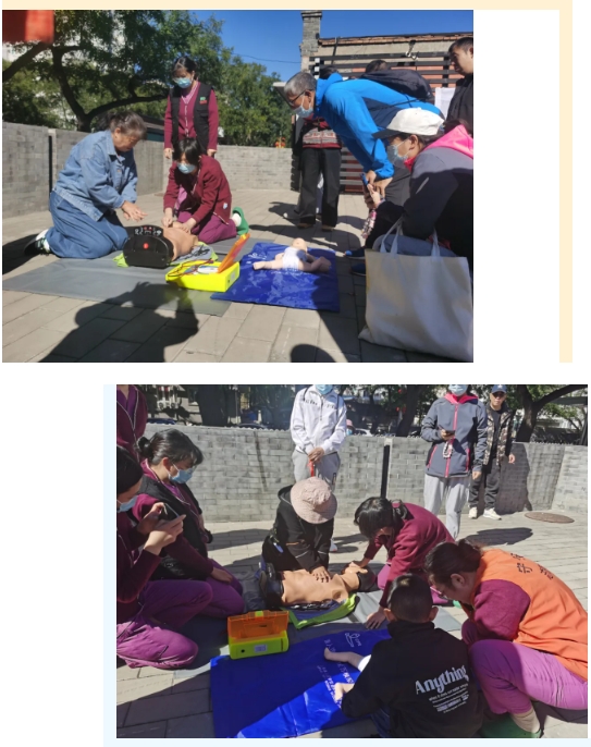 北京中医医院急诊危重症救治中心及门诊第二党支部、门诊团支部的多名医生护士带领群众学习现场安全原则、心肺复苏技术、解除气道异物方法、外伤包扎注意事项等,开展模拟抢救,边讲解边演示,手把手纠正操作动作,解答各类抢救问题,为市民搭建了一个接触急救医疗知识和模拟演练的平台。
