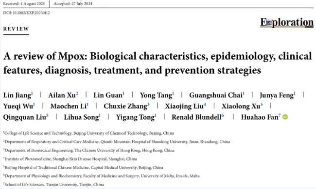 近日,首都医科大学附属北京中医医院、北京化工大学和马耳他大学在《Exploration》杂志(高起点新刊,Instant IF 23.9)联合发表题为《A review of Mpox: Biological characteristics, epidemiology, clinical features, diagnosis, treatment, and prevention strategies》的长篇综述文章,系统阐述了猴痘病毒(MPXV)的流行病学特征、病原学特点、发病机制、救治药物等最新研究进展,同时为中医药防治猴痘病毒提供了研究方向。北京中医医院刘清泉教授、徐霄龙副研究员、北京化工大学范华昊教授、童贻刚教授、宋立华教授及马耳他大学Renald Blundell为本文共同通讯作者。研究工作的开展得到国家自然科学基金(No. 82141202)、国家中医药多学科交叉创新团队(ZYYCXTD-D-202201)等项目资助。