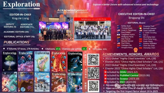 《Exploration》杂志由河南大学、中国生物物理学会纳米生物学分会主办,Wiley出版集团出版发行。自2021年1月正式创刊以来,先后被DOAJ、PubMed Central、Scopus和ESCI收录,2024年CiteScore 17.2,跻身综合期刊世界前5%,篇均引33.2,i10指数95,2025年将获得首个影响因子预计23.9(Web of Science),在中国本土SCI期刊中排名第20。