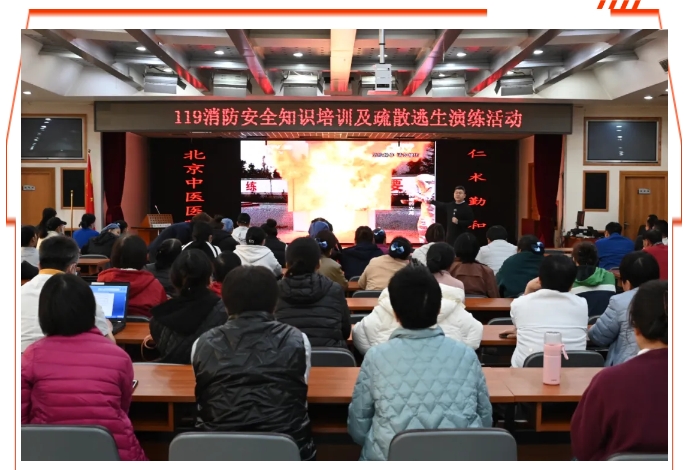 为进一步强化科室主任、护士长、安全员、第三方工作人员的消防安全意识、应急处置和组织领导火灾防范能力,在全国第33个“消防安全宣传月”到来之际,11月19日,首都医科大学附属北京中医医院以“全民消防,生命至上”为主题,开展了消防安全知识培训和疏散逃生演练活动。