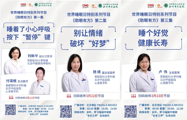 心身医学科主任医师卢伟、副主任医师杨婧、主治医师付清楠、呼吸科副主任医师刘新平以《助眠有方》系列为主题在中央广播电视台老年之声栏目进行科普广播,为患者拥有健康睡眠献上锦囊妙计。