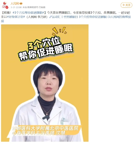 心身医学科主治医师沈慧录制科普视频,向大众介绍按压印堂、百会、内关3个穴位改善睡眠,视频在人民网等平台播出。
