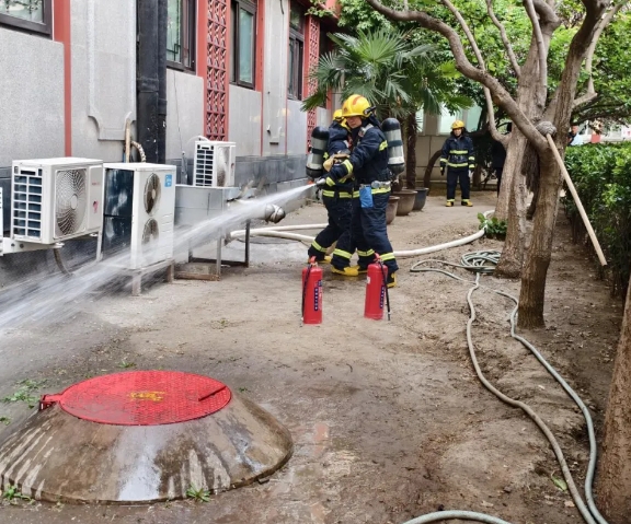 北京中医医院消防站队员到达现场后,按照小型消防站的分工和指令,一部分队员对周边实施警戒,另一部分人员协助消防队员扑灭火情,清理现场火种。10分钟后,火情被完全扑灭。