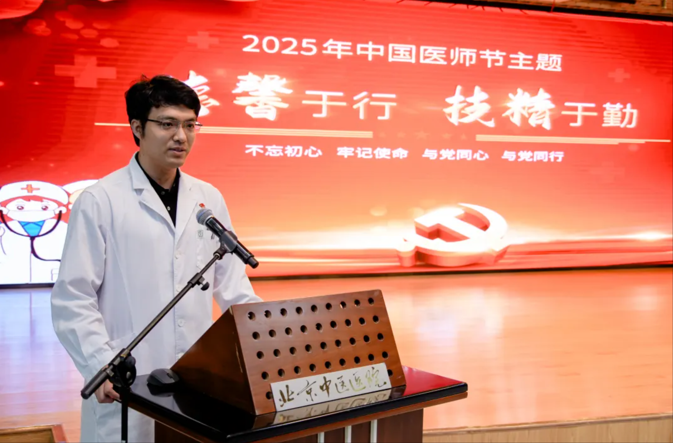 心身医学科李阳代表获奖医师发言,“作为青年医师,加上‘优秀’二字,既是荣誉,更是责任与鞭策。我们能取得的点滴进步,都植根于北京中医医院这片沃土,我们站在巨人前辈的肩膀上,应敢于吃苦、勇于担当,传承精华,守正创新!弘扬‘明德’、‘宽仁’、‘承传’、‘日新’的宽街精神。”