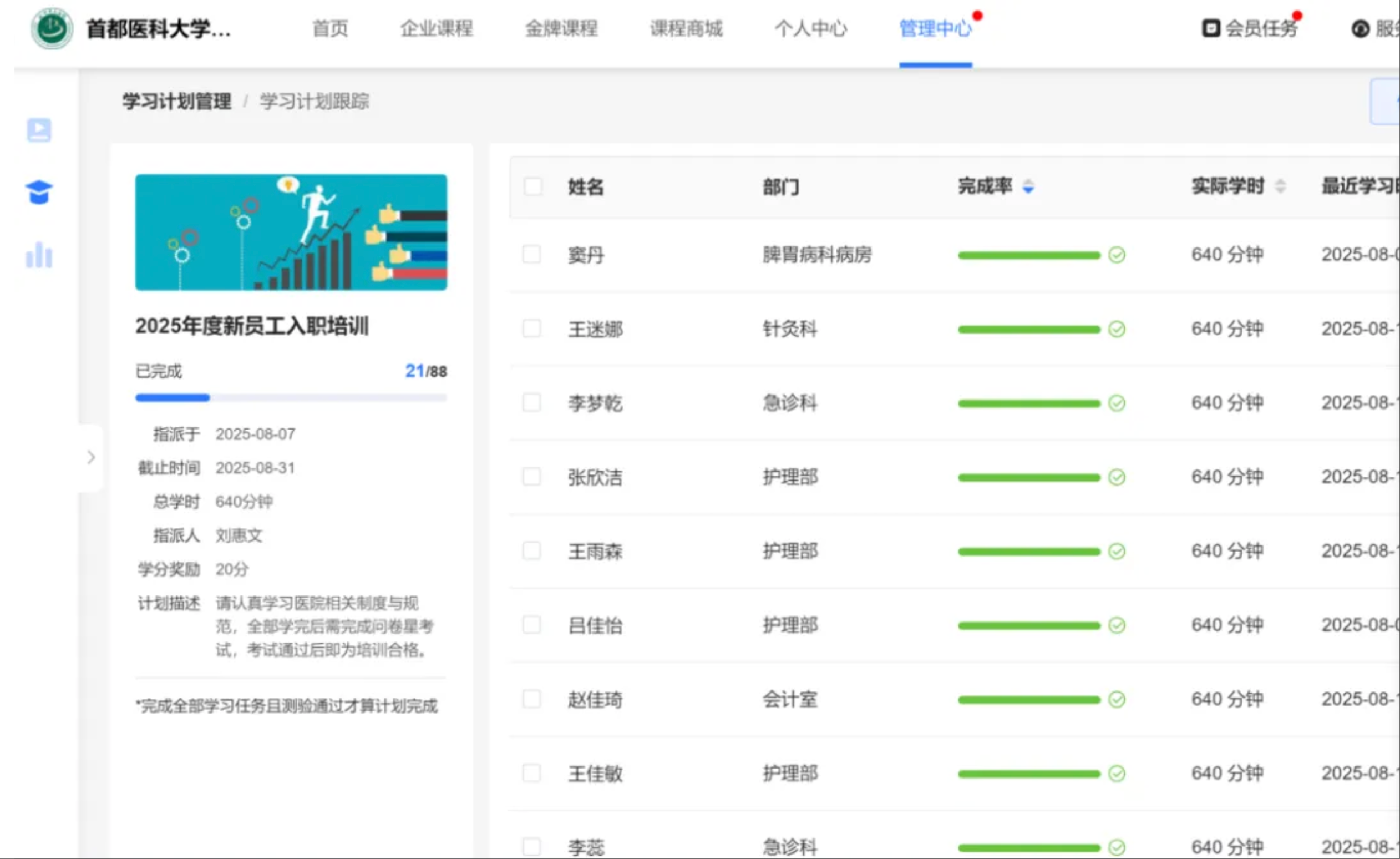 在钉钉学习强院模块里,设置了由职能处室老师主讲的系列培训课程。囊括医院各类制度、职能处室服务范围、行风廉洁培训、消防知识等实用课程并需在听课结束后完成考试。员工只需通过钉钉平台,即可随时随地开启学习之旅,不受时间和空间的限制,还能够根据自身需求反复观看课程内容,加深对知识的理解和掌握,极大地提升了培训的灵活性与高效性。