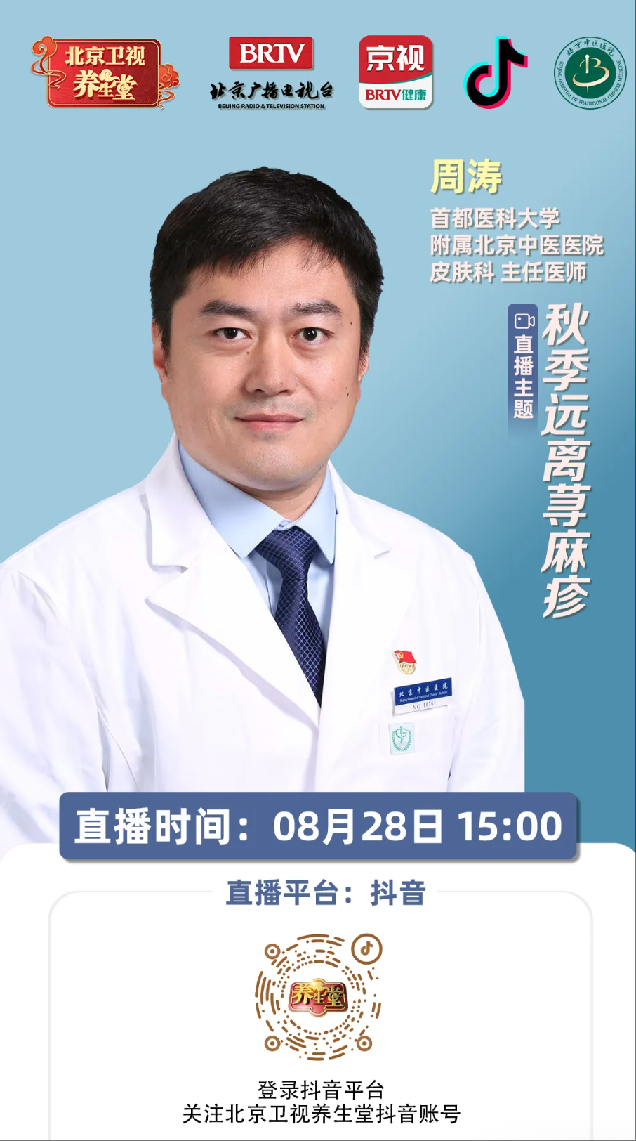 8月28日15:00,首都医科大学附属北京中医医院皮肤科主任医师周涛做客北京卫视养生堂科普直播间,讲解“秋季远离荨麻疹”。