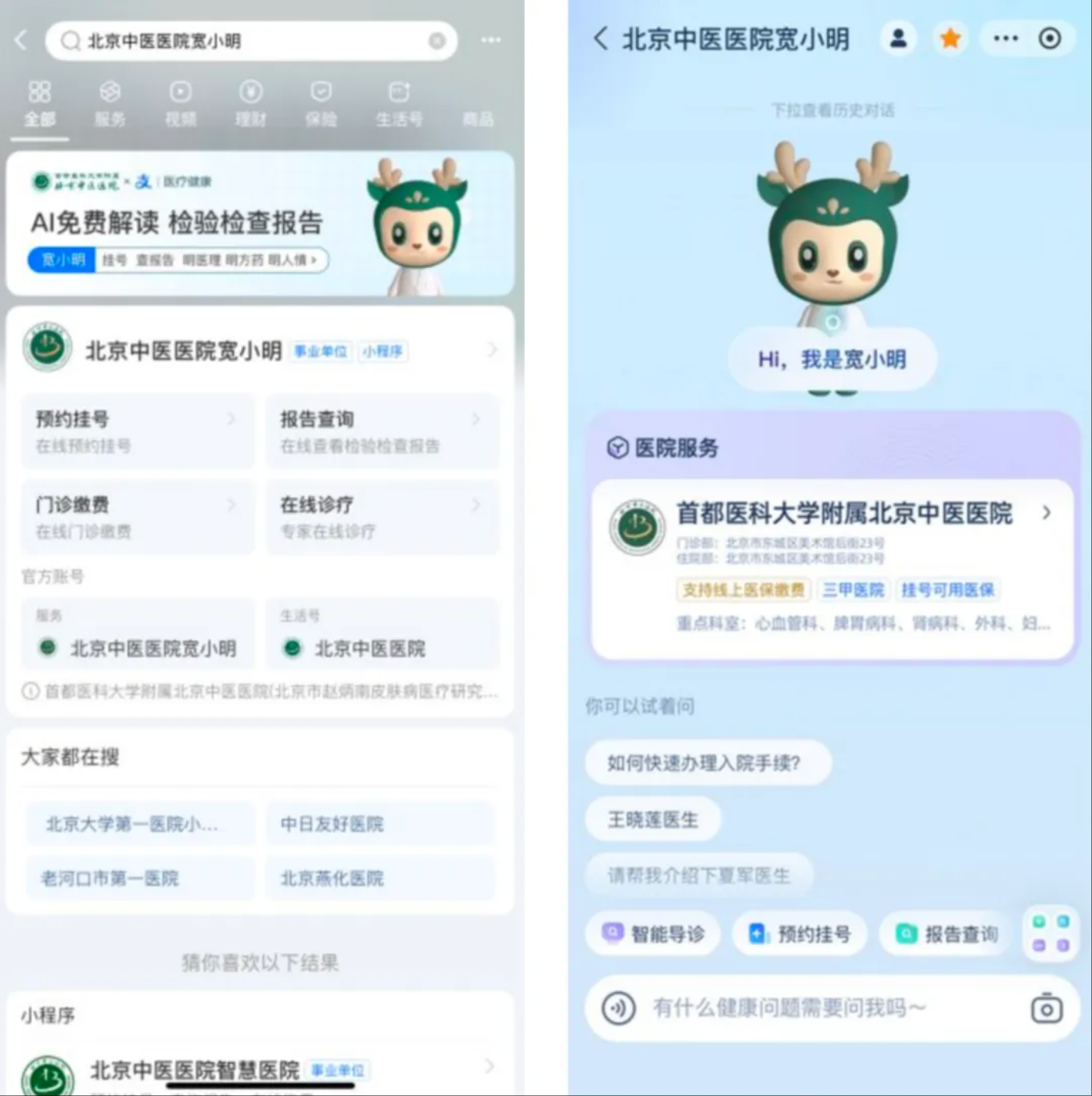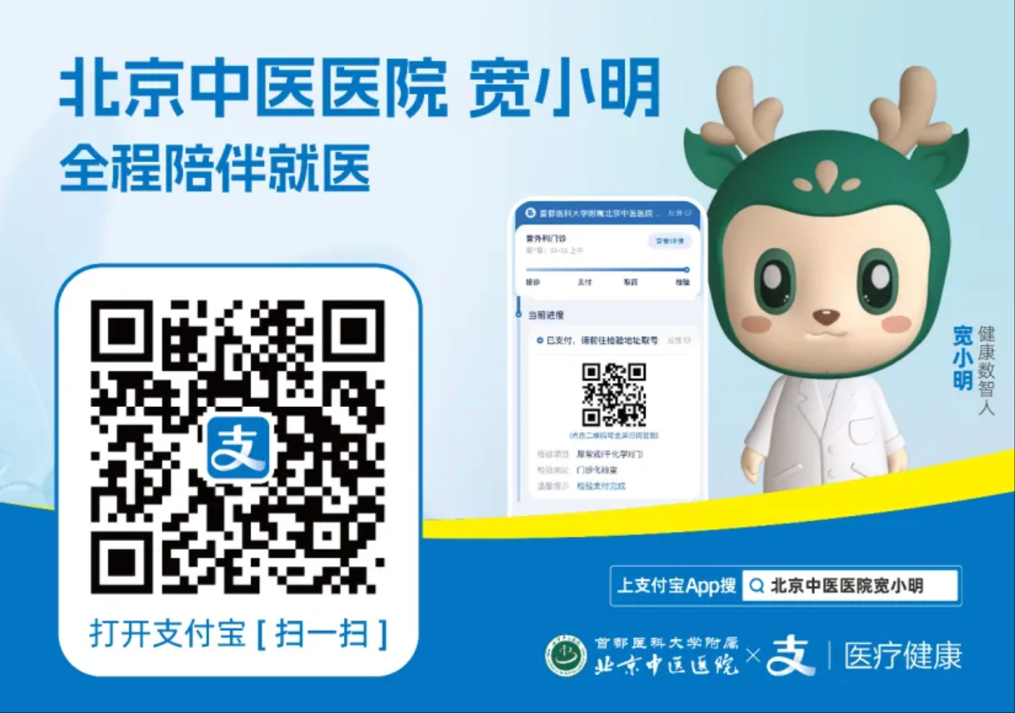 未来,当您有关于健康咨询、就诊需求、医院服务等任何问题,都可以第一时间上支付宝搜索”北京中医医院宽小明”,让可爱的健康数智人“宽小明”给您带来智能、轻松、贴心的就医体验。