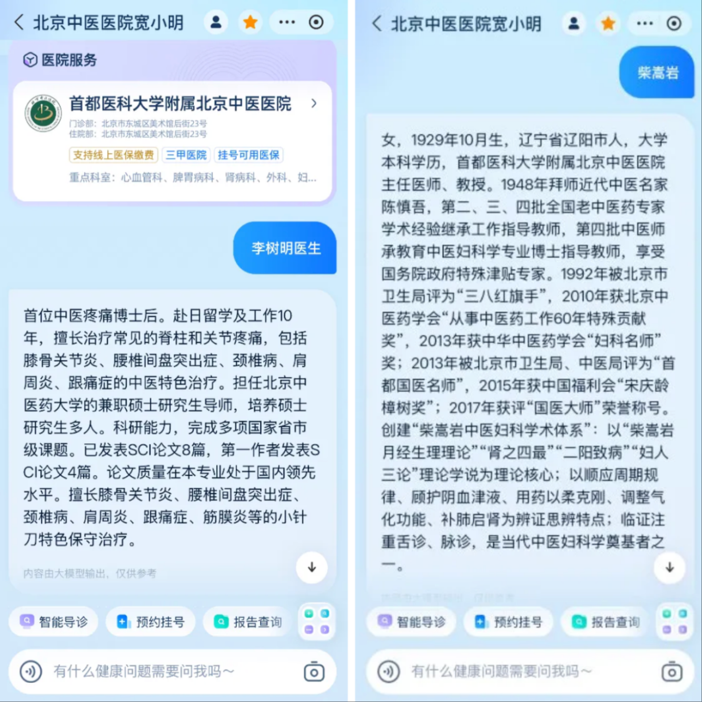 专家介绍:当您需要进一步了解某专家信息,可以直接在“宽小明”对话界面输入该专家的姓名,即可得到最准确的医生信息,让您在就诊前深入了解专家擅长的疾病和治疗方法。