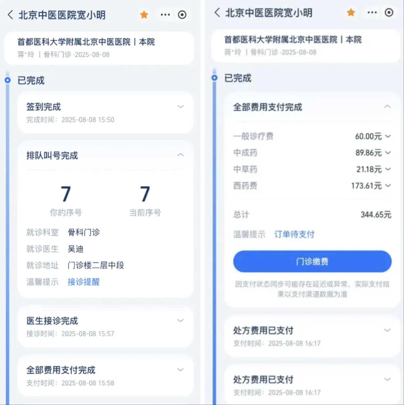 每到一个就诊节点,就会推送相应的信息,并可直接在手机上完成所需操作。比如,排队叫号可以实时在线查看叫号进度,合理安排时间。诊间的处方、检查检验等费用可以直接在线交费,目前也支持北京医保用户在线医保支付,不需要您再奔波于自助机或者收费窗口。