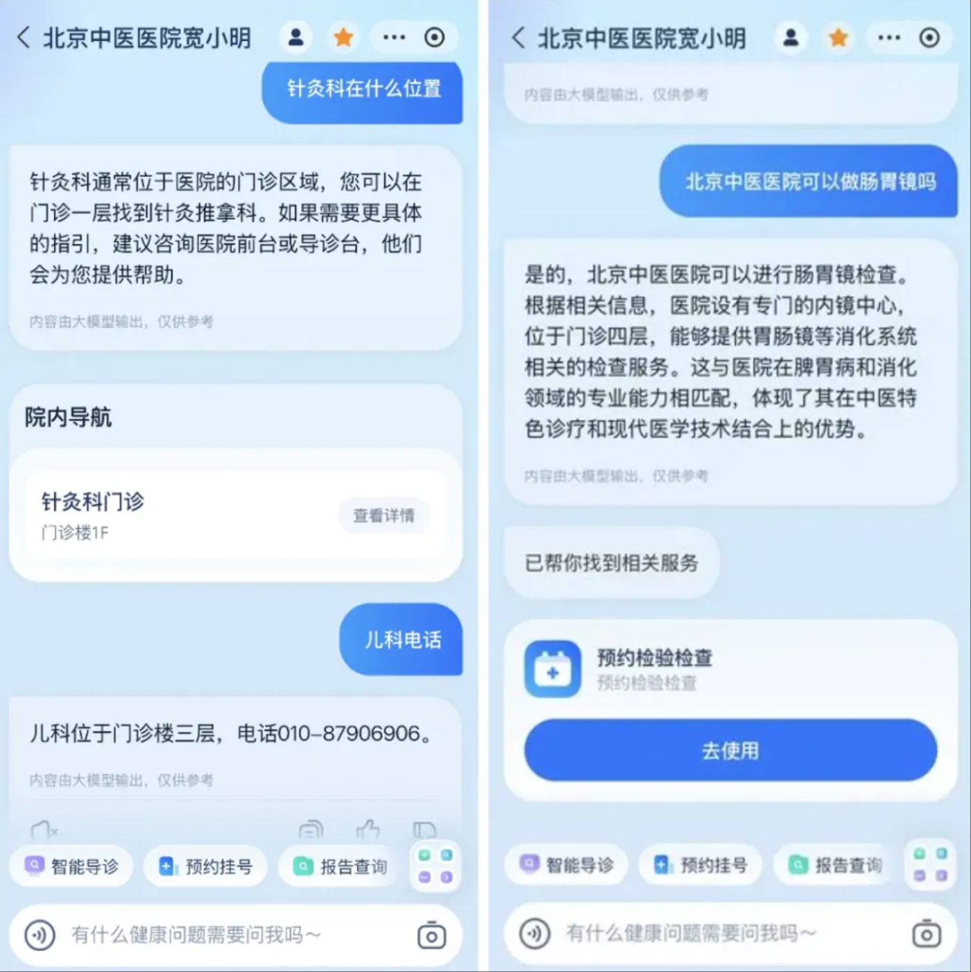 另外,进入医院就诊时,用户经常会为科室位置、服务时间、就诊规则等到处咨询。现在就可以在支付宝上试试问“宽小明”:“针灸科在什么位置”、“北京中医医院是否可以做胃肠镜”、“儿科电话是多少”……这些常见的问题,都能得到及时准确的回复。