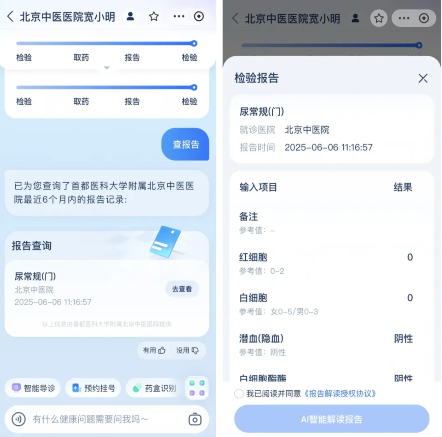 做完检查检验后,无需在院等报告。报告出具的第一时间,“宽小明”就会开启贴心模式立即推送消息请您在线查看。如果想尽快进一步了解异常指标意义,宽小明还能给您简要解读报告。当然,出现异常指标还是需要到医院复诊,请医生给出最终的明确诊断。