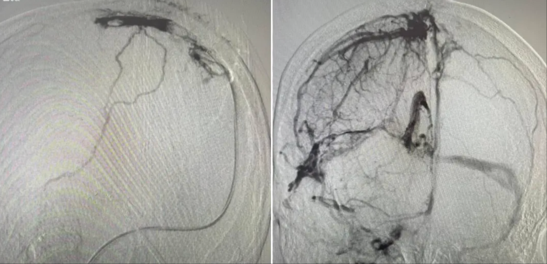 妇科紧急联系针灸科团队马上为她完善相关检查,头颅MRI及头颅MRA提示左侧半卵圆中心新发脑梗死可能,颅内静脉窦血栓待排。经过脑血管造影检查,明确诊断为颅内静脉窦血栓形成。