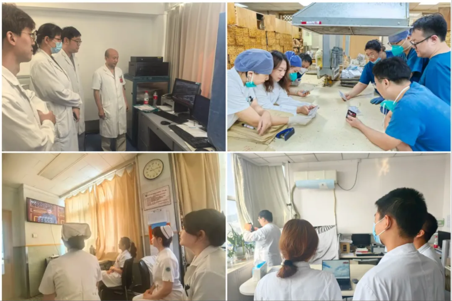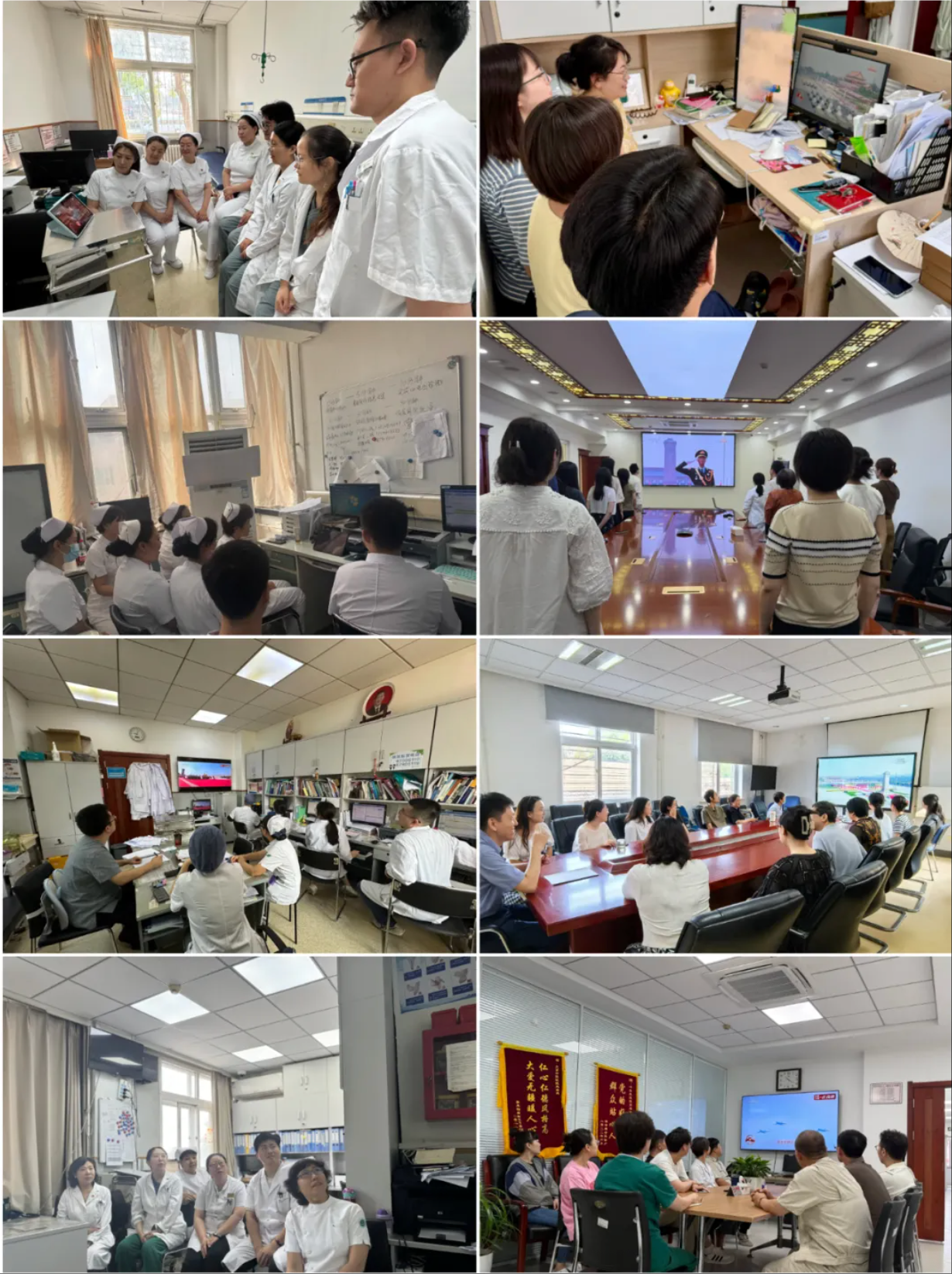 各科室职工在会议室、办公室等场所,通过电视、网络等渠道观看阅兵式。门急诊、药房一线医护人员在不影响正常诊疗工作的前提下也积极观看阅兵直播。