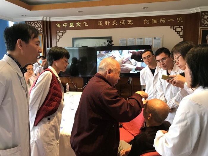 会诊从西医诊断、中医诊断及辨证思路及中西医治疗均给出了详尽的建议。李彬主任对患者病情及会诊思路进行了总结,周德安教授对该患者的针刺取穴和针刺手法做了讲解,并现场演示针对复视患者的针刺方法,重点演示了如睛明穴、承泣透睛明这两个临床容易出现危险的眼周重要穴位的取穴、针刺手法。
