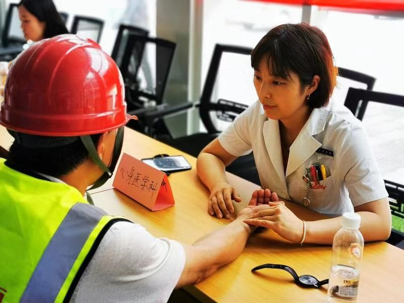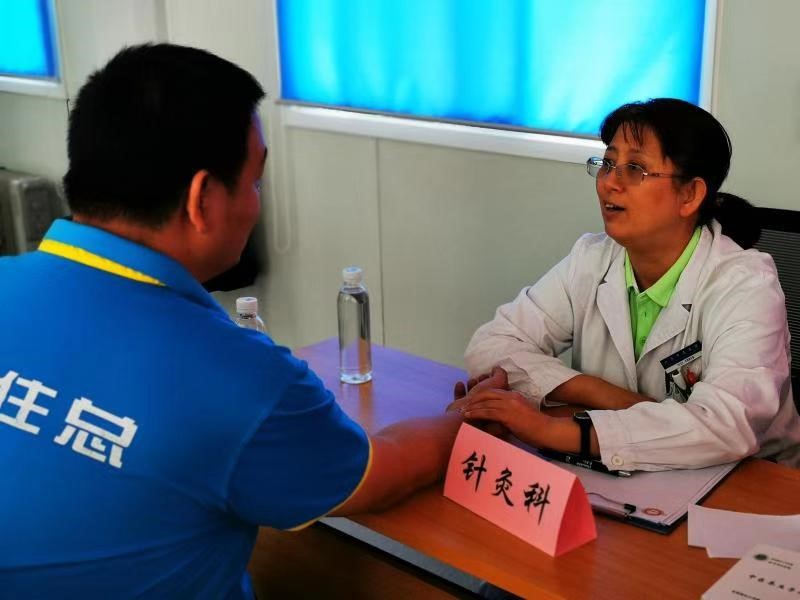 7月18日,在徐春军副院长的带领下,教育、教育二、机关、临一、临三五个党支部联合组织19名党员、入党积极分子来到北京市中建一局建设项目部,为战斗在冬奥会场地建设一线的工人们进行义诊、健康咨询,并赠送药品、中药驱蚊包等。