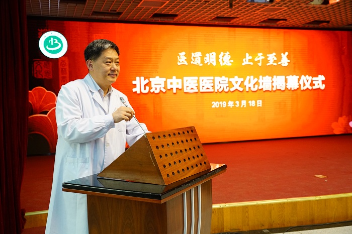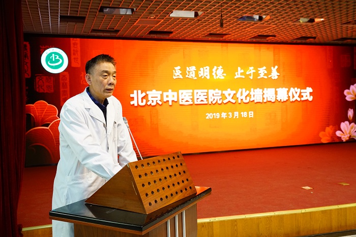 院长刘清泉讲话,他首先感谢中医前辈们为医院建设做出的无私奉献,医院能取得今天的成绩,离不开他们的拼搏和奋斗。放眼未来,我们应勇于承担历史使命,肩负时代重托,以文化墙揭幕为契机,丰富医院文化内涵,推动我院各项事业蓬勃发展。