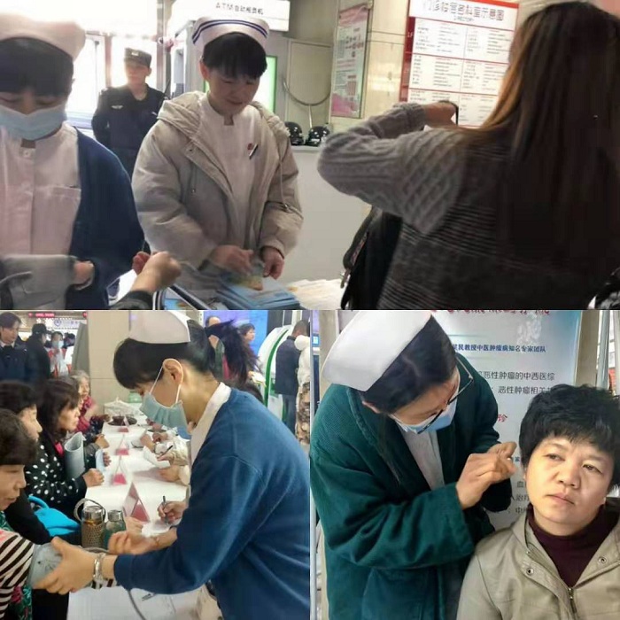 肾脏日当天上午,肾病科在门诊一层大厅举办了专家义诊与健康咨询活动。义诊活动由肾病科主任赵文景亲自带队,包括主任医师王悦芬、副主任医师蔡朕等,为患者答疑解惑、把脉问诊、现场开方、指导用药并讲解肾脏相关知识。李倩护士长带领护理团队为大家测量血压、贴耳豆,发放健康宣传材料。