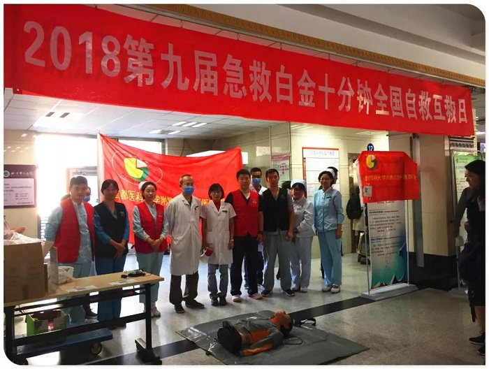 2018年10月10日10时10分,第九届“急救白金十分钟—全国自救互救日”公益活动在我院门诊大厅举行,本期活动主题是:识别“围猝死”预防公众心跳骤停。