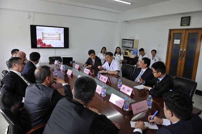 伊斯莫伊洛夫主席对刘清泉院长的介绍表示非常感谢,代表团通过医院宣传片对中医针灸、推拿、按摩、拔罐、汤药等治疗方法和手段有了一定的了解,并就中医能否与现代医学结合治疗、中医治疗切入的时机以及中医医师的培养机制、执业资质的取得等问题进行了深入的探讨。