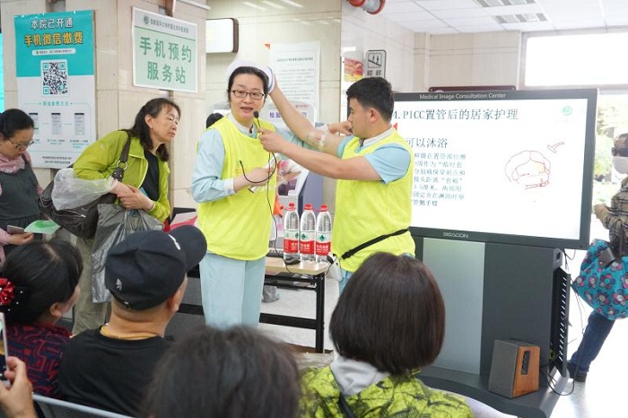 活动中,急诊科男小护乔首昂制作了风趣幽默的幻灯片,用通俗易懂的语言介绍静疗专业知识。使用道具及肢体语言,讲解带管间歇治疗居家患者保护人工血管通路的窍门和方法。静疗小组组长刘红锦、组员关丽、李倩、裴晓璐、张琪在义诊中回答患者的提问。