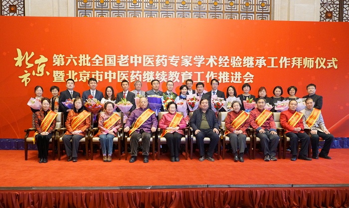 北京市中医管理局副局长罗增刚宣布《第六批全国老中医药专家学术经验继承工作》指导老师及继承人名单。随后,举行了拜师仪式,各位继承人向自己的指导老师献花,指导老师向继承人赠书。